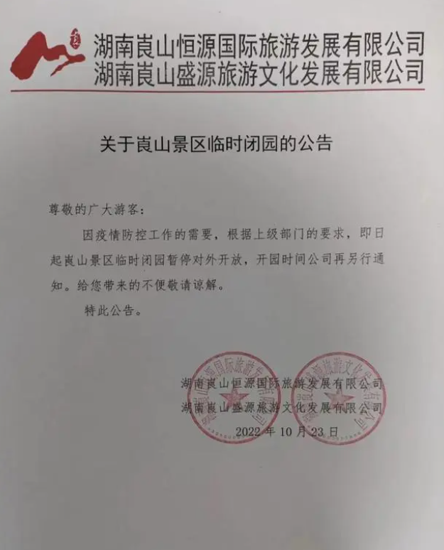 10月25日電 10月24日,崀山旅游區(qū)發(fā)布《關(guān)于崀山景區(qū)臨時(shí)閉園的公告》稱,因疫情防控工作的需要,根據(jù)上級(jí)部門的要求,10月24日起崀山景區(qū)臨時(shí)閉園,暫停對(duì)外開(kāi)放,開(kāi)園時(shí)間將另行通知。