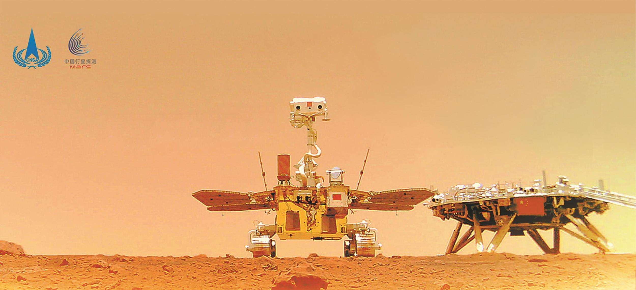 中國首次火星探測(cè)天問一號(hào)任務(wù)“祝融號(hào)”火星車與著陸器合影。國家航天局供圖