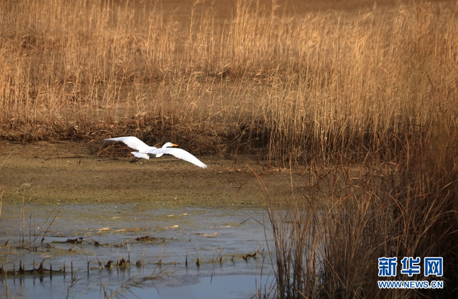 11月19日,一只白鷺在甘肅省敦煌市黨河濕地飛翔。新華網(wǎng)發(fā) (張曉亮 攝)