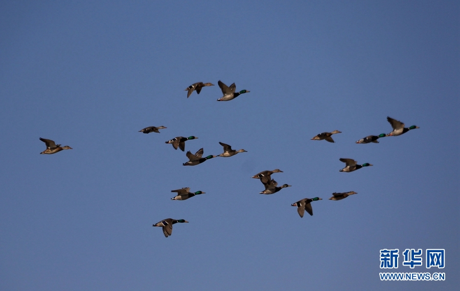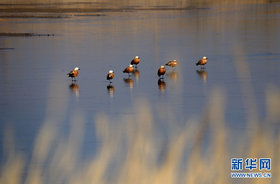 初冬時(shí)節(jié),位于鳴沙山下的甘肅省敦煌市黨河濕地,白鷺、綠頭鴨、赤麻鴨、灰雁等候鳥在這里棲息、飛翔、覓食,構(gòu)成了一幅和諧美麗的生態(tài)畫卷。