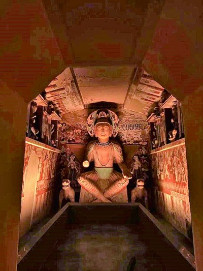 本次展覽從敦煌研究院引進(jìn)了敦煌最早的石窟之一、北涼三窟中最大的275窟的復(fù)制窟,觀眾可以沉浸式體驗(yàn)1∶1數(shù)字化、高保真復(fù)制的經(jīng)典藝術(shù)窟,身臨其境地走進(jìn)敦煌莫高窟。