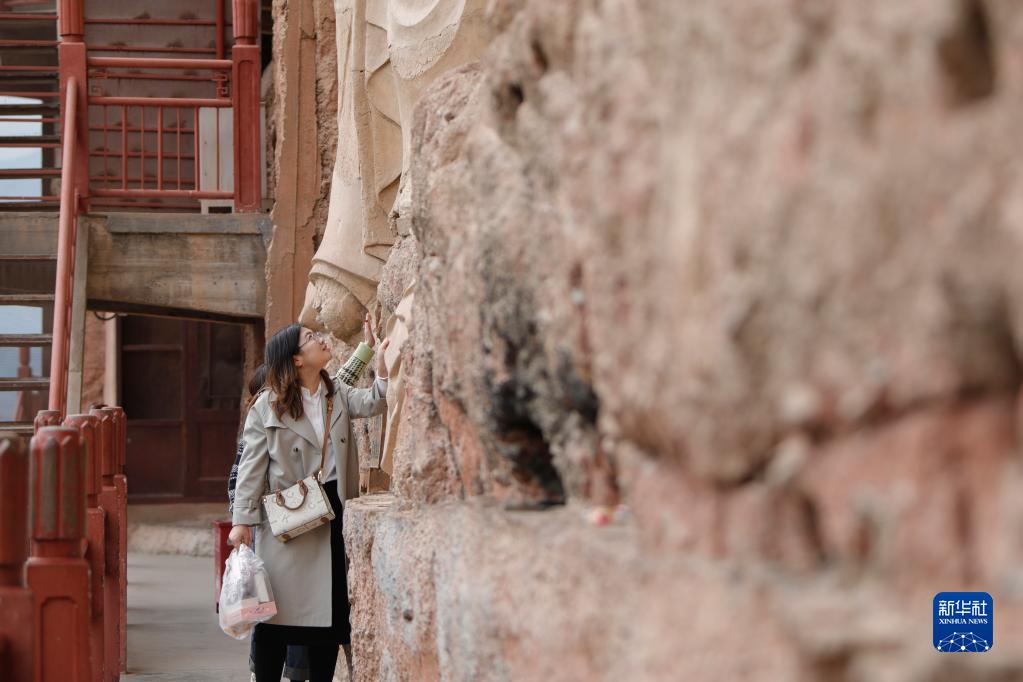 4月1日,游客在麥積山石窟參觀。新華社記者 方欣 攝