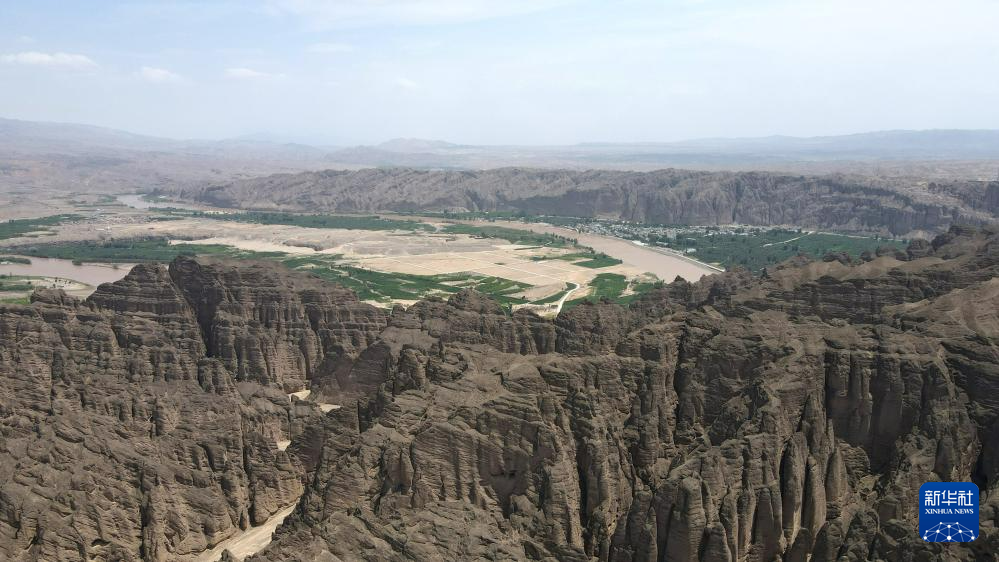 這是位于甘肅省白銀市景泰縣中泉鎮(zhèn)龍灣村的黃河石林景觀。黃河石林千峰競奇、峽谷蜿蜒,與黃河遙相呼應(yīng),形成山環(huán)水轉(zhuǎn)、動靜結(jié)合的自然奇觀(7月11日攝,無人機(jī)照片)。新華社記者 方欣 攝