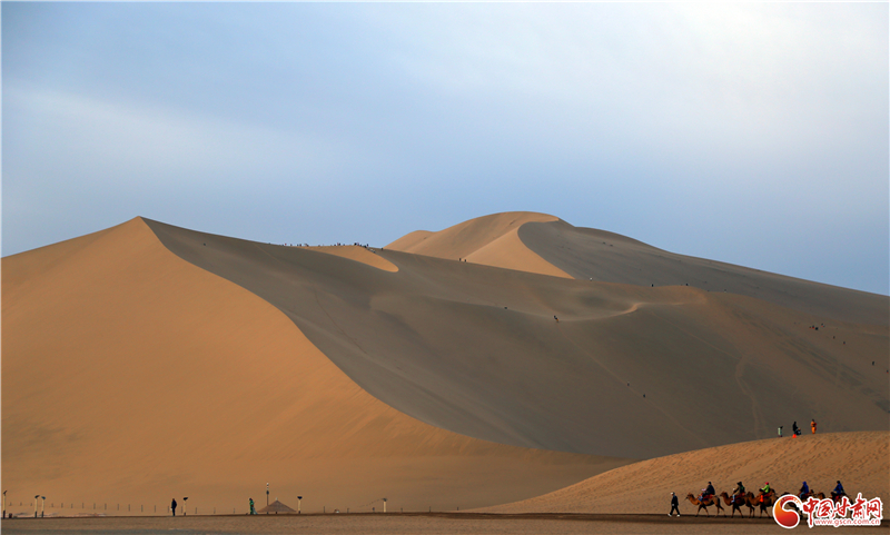 鳴沙山以沙動(dòng)成響而得名,峰巒危峭,山脊如刃。最早在東漢辛氏《三秦記》中有“河西有沙角山,峰崿危峻,逾于石山,其沙粒粗色黃,有如乾糒……人欲登峰,必步下入穴,即有鼓角之聲,震動(dòng)人足”的記載。而月牙泉是環(huán)抱在鳴沙山中的一灣清泉,形如玄月,故名“月牙泉”,并形成了鳴沙山月牙泉景區(qū),被譽(yù)為“塞外風(fēng)光之一絕”。