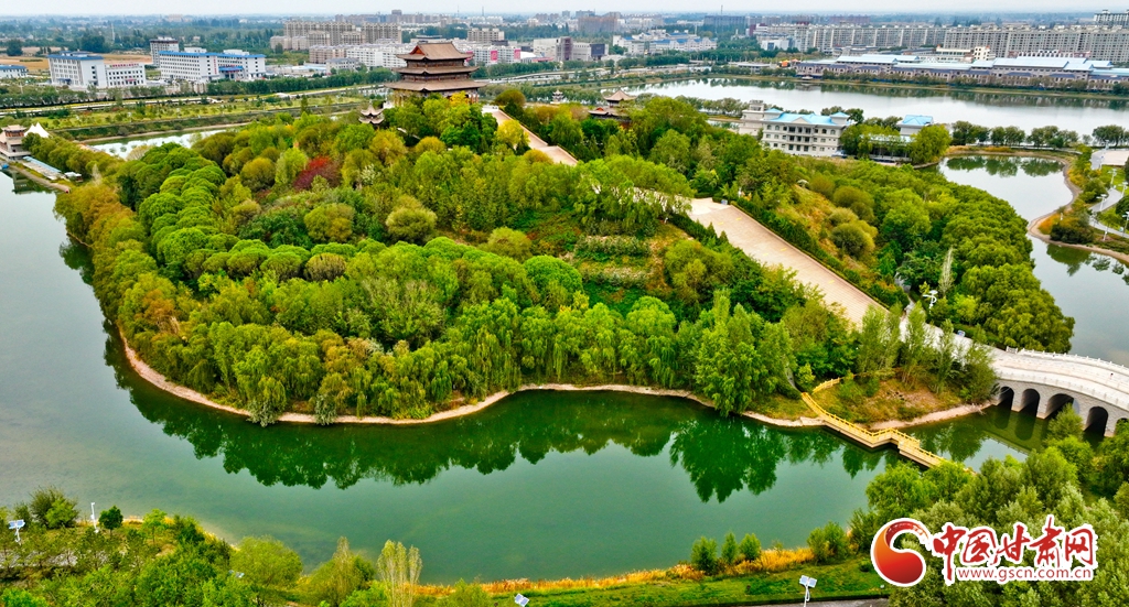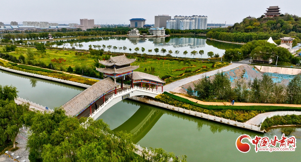 10月5日,鳥瞰甘肅省張掖市臨澤縣,人行步道沿湖蜿蜒,湖水清澈潔凈,岸邊美景倒映湖中,一幅繪著水鄉(xiāng)之美的畫卷躍然眼前。