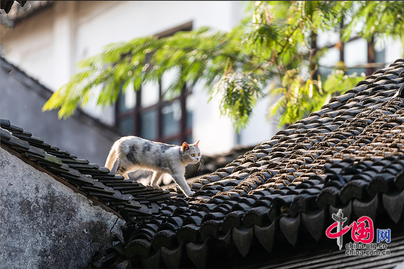 在毛孩子眼里,這就是包容一切活動(dòng)的「游樂(lè)場(chǎng)」,片片青瓦上留下梅花印。或許你也該往古鎮(zhèn)的屋頂上瞧,檐角翹伸、清風(fēng)古韻,讓人心曠神迷?;蛲侵回堃粯优噬细咛帲拼翱茨撬菢?,那木門(mén)青瓦,就是江南水鄉(xiāng)的具象。