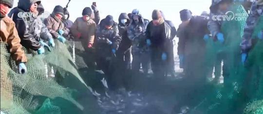 在克什克騰旗達(dá)里湖現(xiàn)場(chǎng),人工鑿冰、冰下走網(wǎng),冬捕隊(duì)員在作業(yè)時(shí)選用5公分網(wǎng)眼,這樣捕魚時(shí)就能漏掉小魚。馬拉絞盤將大網(wǎng)拖拽出網(wǎng)口,滿載魚兒的漁網(wǎng)慢慢地從湖水中出來(lái),游客們感受豐收的喜悅。