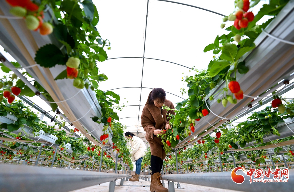 1月15日,甘肅省張掖市甘州區(qū)靖安鄉(xiāng)一草莓種植大棚內(nèi),游客正帶著小朋友采摘草莓。