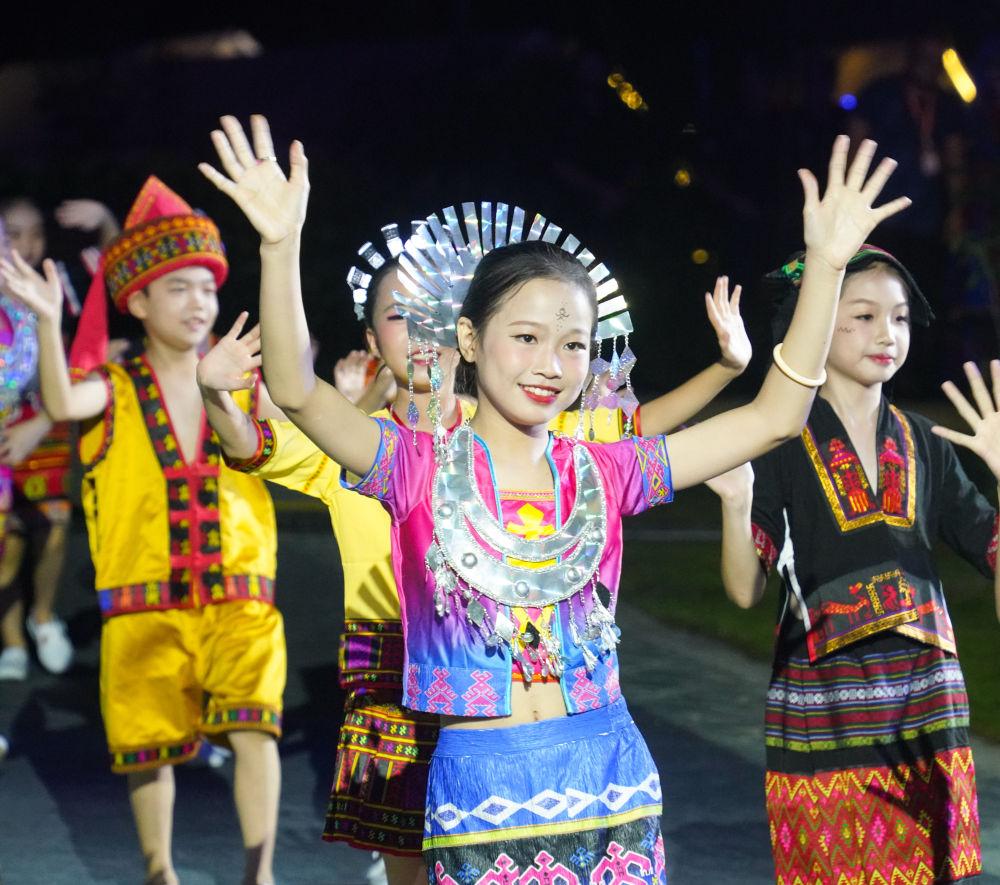 ↑2023年9月16日,海南省五指山市民族時(shí)裝“村秀”系列文化活動(dòng)開(kāi)幕。鄉(xiāng)鎮(zhèn)居民身著黎族、苗族傳統(tǒng)和創(chuàng)新設(shè)計(jì)服飾,向人們展示民族傳統(tǒng)文化的魅力。圖為展示服裝的小朋友與觀眾互動(dòng)。新華社記者 樊雨晴 攝
