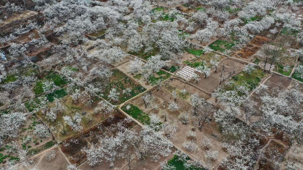 這是3月9日在隴南市武都區(qū)城關(guān)鎮(zhèn)石家莊村拍攝的櫻桃花(無人機照片)。 新華社記者 陳斌 攝