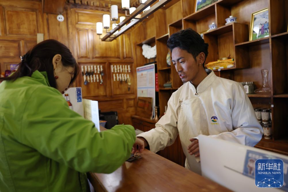 ↑ 扎尕那村一家民宿工作人員仁青(右)在為游客辦理入?。?月27日攝)。新華社記者 陳斌 攝