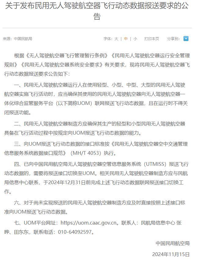 11月15日,民航局發(fā)布《關(guān)于發(fā)布民用無人駕駛航空器飛行動態(tài)數(shù)據(jù)報送要求的公告》(以下簡稱《公告》)。