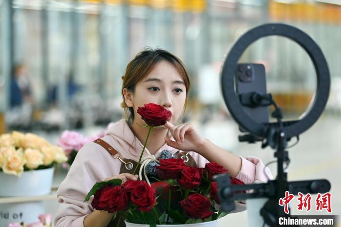 11月20日,在甘肅省臨夏回族自治州臨夏市百益億農(nóng)國際鮮花港內(nèi),工作人員進行網(wǎng)絡直播售賣鮮切玫瑰。九美旦增 攝