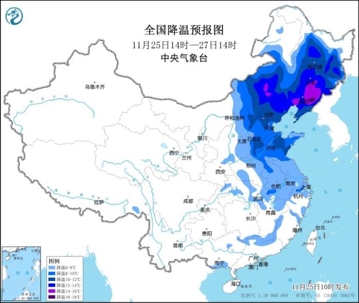 預(yù)計(jì),11月25日14時(shí)至11月27日14時(shí),內(nèi)蒙古中東部、華北、東北地區(qū)中南部、黃淮、江淮、江漢東部、江南北部等地將先后降溫6~10℃,其中,內(nèi)蒙古中部、華北北部、東北地區(qū)中南部等地部分地區(qū)降溫可達(dá)12℃以上。