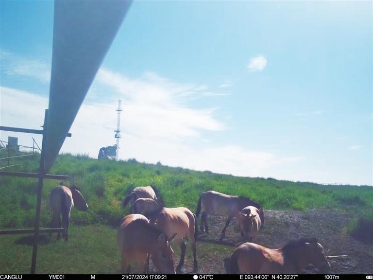 近日,甘肅敦煌西湖國家級自然保護(hù)區(qū)管護(hù)中心工作人員整理紅外相機(jī)拍攝畫面時,發(fā)現(xiàn)拍攝到普氏野馬“哺乳”的清晰影像。畫面拍攝于今年7月下旬,有8匹普氏野馬繁殖群正在馬圈灣濕地的飲水泉附近活動,其中有一匹小馬駒滿足地吸吮著母馬的乳汁。據(jù)監(jiān)測,該小馬駒出生于6月上旬,畫面中約已有一個半月大小,身體健康,毛色光亮。這個繁殖群領(lǐng)地范圍主要從馬圈灣西觀景臺至馬圈灣東高地,該區(qū)域可采食物種類豐富、水源充沛,是適合普氏野馬生活的美麗家園。普氏野馬是國家一級重點(diǎn)保護(hù)動物,常棲息于山地、草原和荒漠,性機(jī)警、善奔跑。近年來,隨著敦煌西湖保護(hù)區(qū)生態(tài)環(huán)境保護(hù)力度加大,生態(tài)環(huán)境質(zhì)量持續(xù)改善,群眾保護(hù)野生動植物的意識不斷增強(qiáng),使野生動物活動范圍不斷擴(kuò)大,種群數(shù)量不斷增加。截至目前,敦煌西湖保護(hù)區(qū)內(nèi)普氏野馬種群數(shù)量已達(dá)166匹。