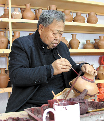 64歲的閻建林(見圖,本報(bào)記者趙帥杰攝)是甘肅省級非物質(zhì)文化遺產(chǎn)項(xiàng)目陶器制作技藝代表性傳承人。走進(jìn)他位于定西市臨洮縣洮陽鎮(zhèn)河口村的家中,院落里、窗臺上,擺滿了大大小小的陶器,足有上百種。“主要是馬家窯彩陶工藝品,敞口的是盆,帶頸的為罐,耳部安有提手的,還可以稱作壺。”閻建林介紹。