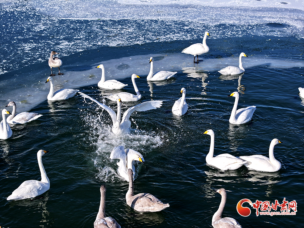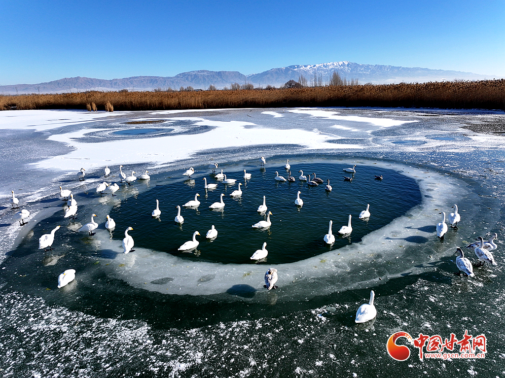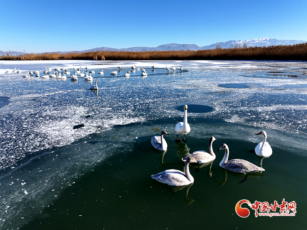 近日,在甘肅省張掖國家濕地公園,成群的越冬天鵝在冰封的湖面上悠然覓食、嬉戲,構成了一幅動人的生態(tài)畫卷,成為冬日里一道尤為引人注目的風景線。