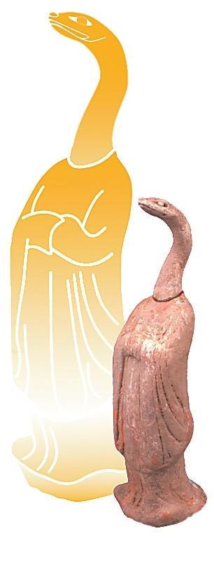伏羲和女媧是中國神話傳說中的創(chuàng)世神靈,被視為人類文明的始祖。相傳他們均為蛇身人首的形象,象征著自然與人類的和諧統(tǒng)一。伏羲被認(rèn)為是發(fā)明八卦、結(jié)繩記事的智者,開啟了中華文明的智慧之門;而女媧則以其神力摶土造人,煉石補天,維護了天地的秩序。展覽中展出的高臺縣博物館館藏的一件魏晉時期的女媧圖彩繪壁畫磚。畫面繪女媧,人首蛇身,獸足,頭梳高髻,著交領(lǐng)紅裳,右手持月輪,月輪內(nèi)有蟾蜍,左手持規(guī),周圍繪云氣。同時,還展出了一件高臺縣博物館館藏魏晉時期的伏羲女媧畫像磚,左側(cè)女媧,一手持矩、一手拿陰物,人首、蛇身、獸足、挽高髻、著交領(lǐng)長衣,腹部繪月輪;右側(cè)伏羲,右手持規(guī),左手持日,內(nèi)有一金烏,周圍云氣環(huán)生,意在天界暢游。兩磚拼合形成陰陽交合圖,為墓葬中室頂部藻井彩繪圖像。畫像中人首蛇身的伏羲、女媧形象,濃縮著中國上古時代的蛇崇拜意識。我國古代有天圓地方之稱,伏羲執(zhí)規(guī)象征天,女媧執(zhí)矩象征地,反映了墓主人追隨升天的愿望,也期望其后代能夠繁衍生息。