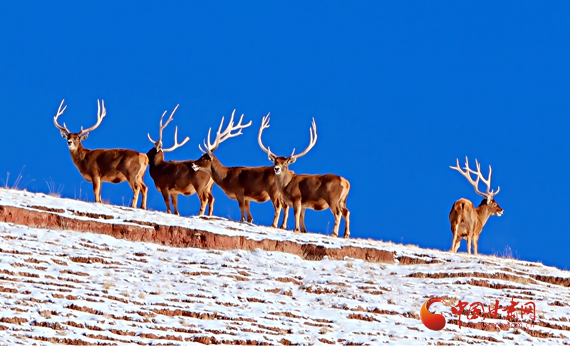 畫面顯示,在白雪皚皚的祁連山之上,五只白唇鹿駐足停留,仿佛也在欣賞祁連山美景,這些白唇鹿體態(tài)壯碩、動作靈活,在鹿群“首領(lǐng)”的帶領(lǐng)下越過山坡,前往下一個覓食地。