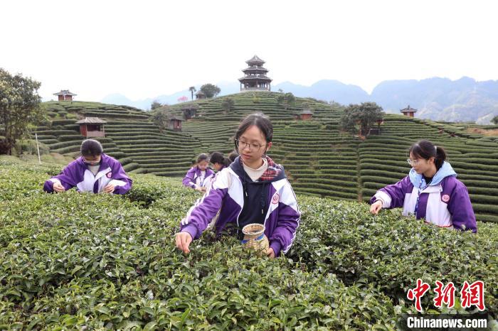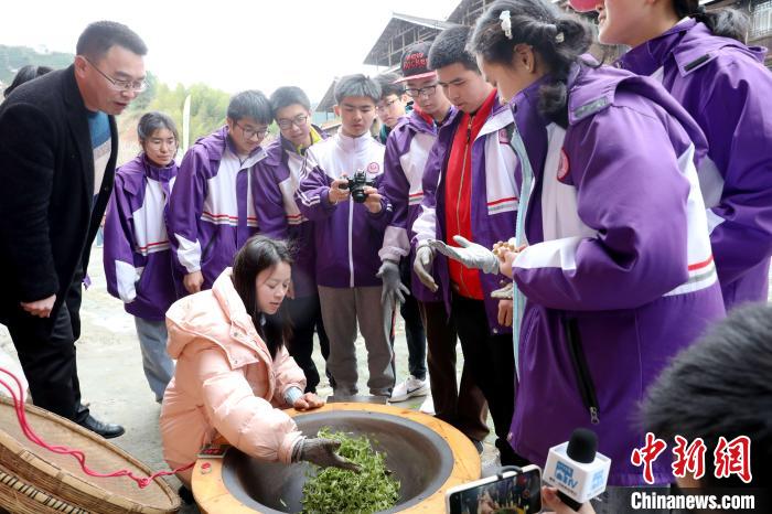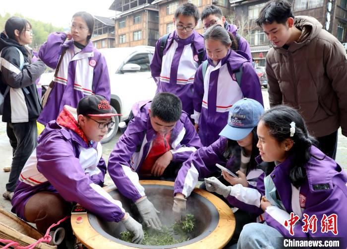 3月15日至16日,廣西柳州市一所中學組織千人研學團到三江侗族自治縣八江鎮(zhèn)布央村仙人山景區(qū)開展茶文化研學活動,沉浸式采春茶、炒春茶、品春茶,深入了解茶種植、茶制作、茶文化、茶品鑒等知識,進一步培養(yǎng)實踐能力、提高勞動素養(yǎng)。圖為研學活動現(xiàn)場。龔普康 攝