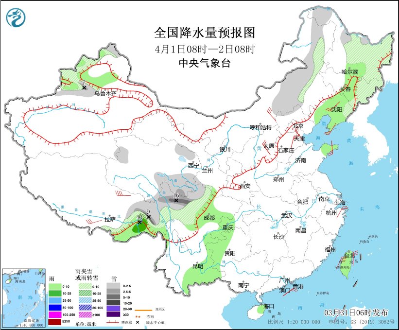 4月1日08時至2日08時,內(nèi)蒙古東部、黑龍江中東部、吉林東部、遼寧東北部、新疆西北部山區(qū)、西藏東部、青海南部、川西高原北部等地部分地區(qū)有小到中雪或雨夾雪,其中,新疆沿天山地區(qū)、西藏東部、川西高原北部等地部分地區(qū)有大雪,局地暴雪(10~16毫米)。新疆伊犁河谷和北疆盆地、西藏東南部、吉林中部、遼寧大部、山東半島、西南地區(qū)東部和南部、海南島東部、臺灣島等地部分地區(qū)有小到中雨,其中,西藏東南部等地局部地區(qū)有大雨(25~40毫米)。西藏南部、內(nèi)蒙古中部、遼寧中南部、河北中南部、天津、山西、山東半島、浙江東部等地部分地區(qū)有4~6級風(fēng),西藏東部部分地區(qū)有6~7級風(fēng);渤海、渤海海峽、黃海西部、東海南部、臺灣海峽、臺灣以東洋面、巴士海峽、南海中北部海域有6~7級風(fēng),陣風(fēng)8級。
