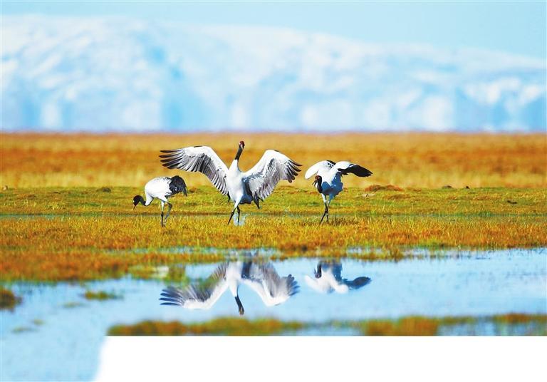尕海湖的晨霧尚未散盡,黑頸鶴的赤紅色頭頂已經(jīng)開(kāi)始閃現(xiàn)。它們?cè)谔Σ蓍g跳起求偶之舞,頭頂?shù)闹旒t隨舞步明滅,如同螢火蟲(chóng)的閃光。新孵化的雛鶴,棕黃色絨羽間染著乳白,是大地贈(zèng)予新生命的第一抹色彩。這種國(guó)家一級(jí)保護(hù)動(dòng)物蹣跚學(xué)步時(shí),總被親鳥(niǎo)用長(zhǎng)喙輕推,這場(chǎng)景會(huì)令保護(hù)區(qū)巡護(hù)員想起女兒初學(xué)自行車(chē)時(shí)自己的緊張。