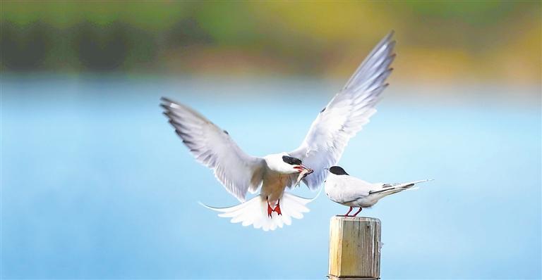 敏捷的普通燕鷗在洲灘養(yǎng)足了精神,當(dāng)它的雪白翼尖剪開(kāi)霧幕時(shí),巢卵正藏在浮筏水草的根部。雛鳥(niǎo)破殼時(shí)頭頂戴著略染橘紅的胎帽,像是自然為新生者加冕。不論是饑腸轆轆還是飽食小魚(yú),它的叫聲總是尖銳清脆,猶如冰裂,與尕海湖的水聲交織成夏日搖籃曲。