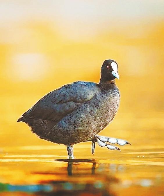 白骨頂又被喚作骨頂雞,卻是鶴類(lèi)的遠(yuǎn)親。它靜浮水面時(shí),額前一抹象牙白,宛若遺落人間的墨玉鎮(zhèn)紙。這枚額甲實(shí)為特化的角質(zhì)層,是為了保護(hù)頭部的盔胄?;野咨陌牾肴缪┑匮グ惆洪g,劃開(kāi)水藻時(shí)泛起粼粼波光——這身黑羽配雪蹼的穿搭,竟比時(shí)裝周的極簡(jiǎn)主義更先鋒。當(dāng)它們列隊(duì)掠過(guò)蘆葦蕩,水淼勾勒的剪影里,仿佛在繪制著秋天的信箋。