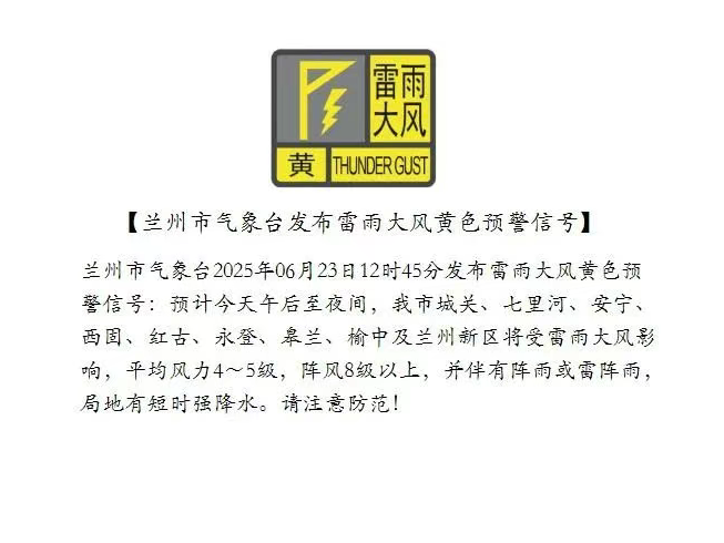 蘭州市氣象臺(tái)2025年06月23日12時(shí)45分發(fā)布雷雨大風(fēng)黃色預(yù)警信號:預(yù)計(jì)今天午后至夜間,我市城關(guān)、七里河、安寧、西固、紅古、永登、皋蘭、榆中及蘭州新區(qū)將受雷雨大風(fēng)影響,平均風(fēng)力4~5級,陣風(fēng)8級以上,并伴有陣雨或雷陣雨,局地有短時(shí)強(qiáng)降水。請注意防范!