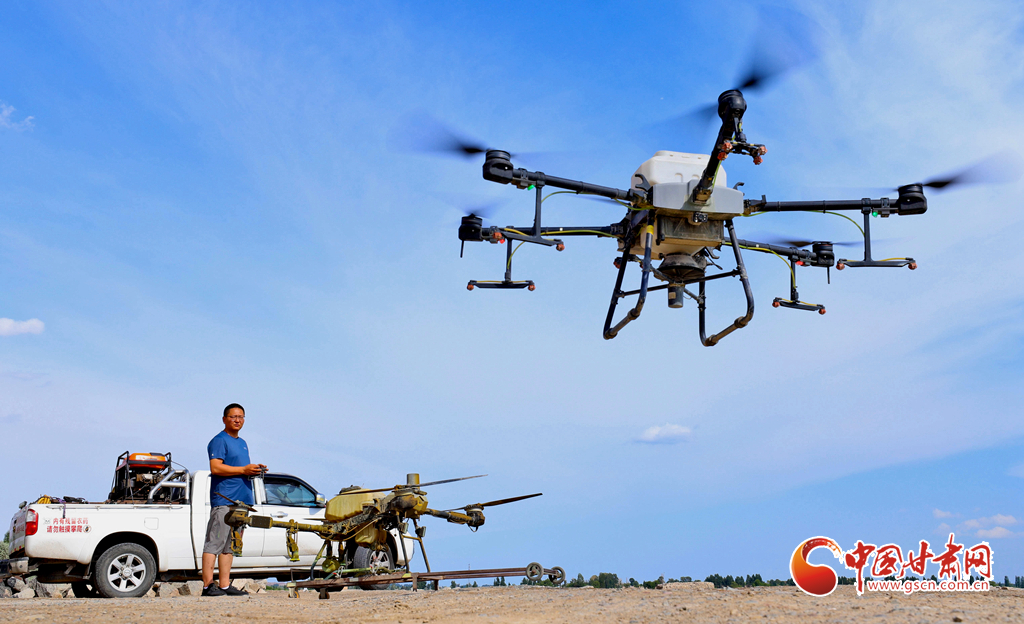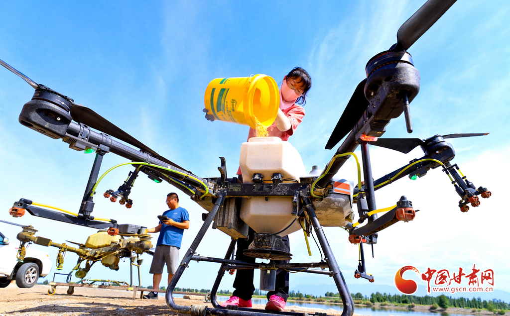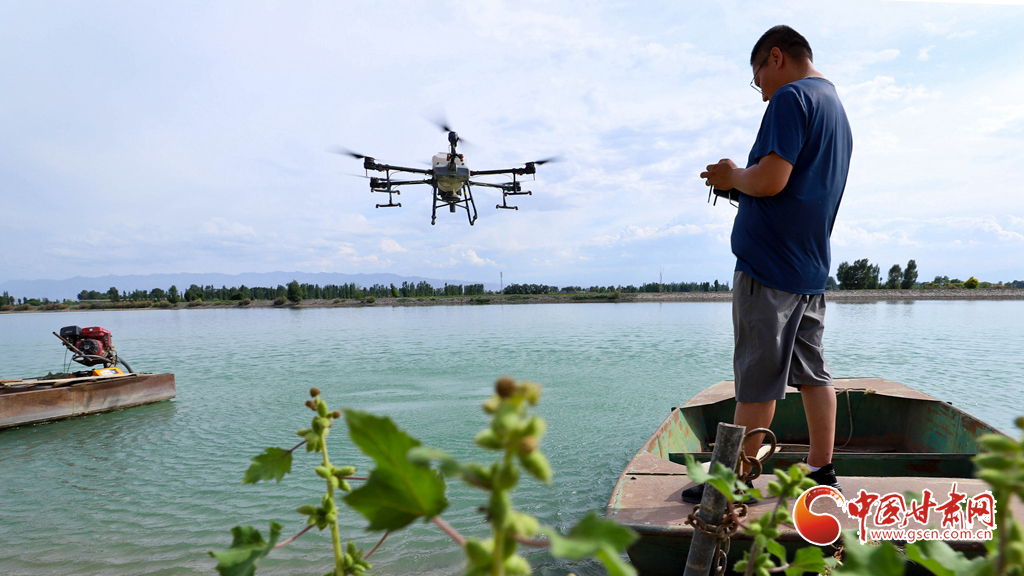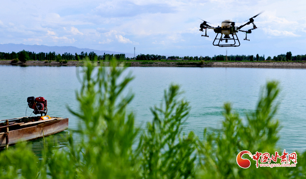 6月24日,在高臺縣夾溝湖水庫螃蟹養(yǎng)殖基地,無人機操作手啟動設備,載滿飼料的無人機沿預設航線在800多畝螃蟹養(yǎng)殖基地上空精準投喂。