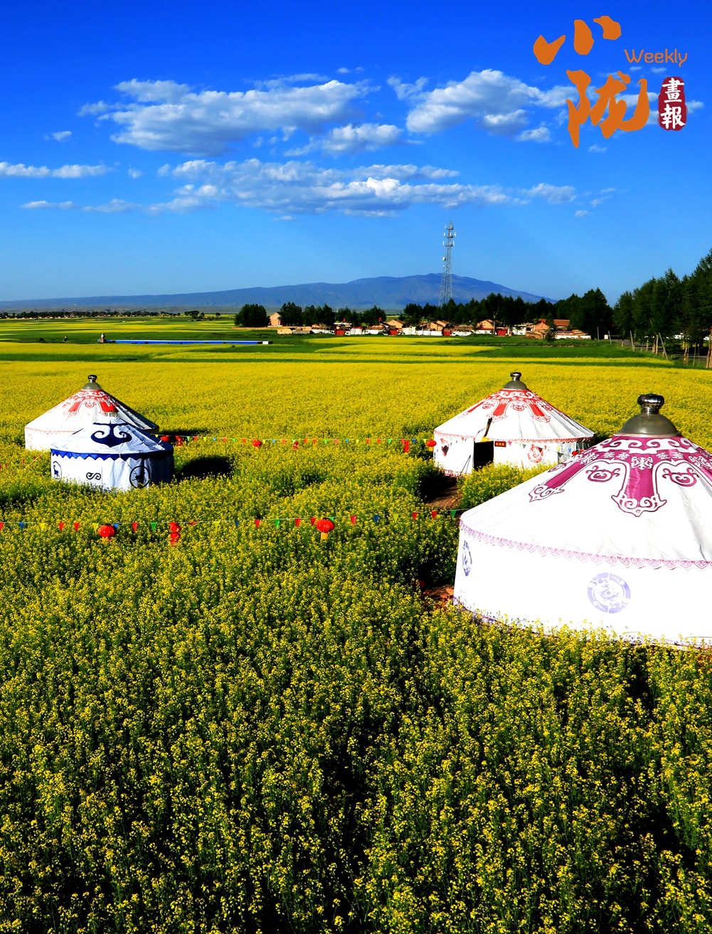 廣袤無(wú)邊的田野生機(jī)盎然,金黃色的油菜花夾雜著一塊塊碧綠色的麥田,好像給大地鋪上了一層五顏六色的大地毯。漂亮的民居鑲嵌其中,與祁連山相互輝映,在陽(yáng)光下美麗極了!