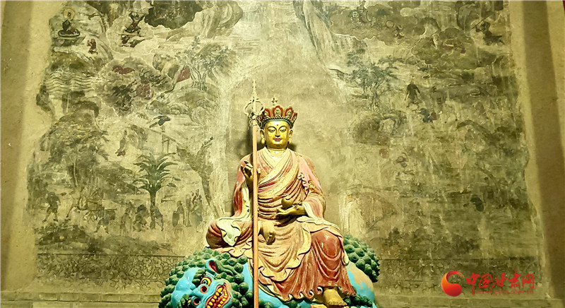 這幅壁畫繪于大佛殿內(nèi)大佛身后墻壁,色彩雖已斑駁,卻仍難掩其藝術(shù)價(jià)值,是大佛殿內(nèi)時(shí)代較早、藝術(shù)水準(zhǔn)極高的作品。它距地面高1.55米,上下兩端用墨線勾出邊欄,邊欄內(nèi)繪纏枝牡丹點(diǎn)綴;《西游記》故事圖居于正中,殘長(zhǎng)約4.4米,殘高約2.9米,面積約12.7平方米,壁畫前今塑有地藏王菩薩像一尊。壁畫由“取水子母河”“道昧放心猿”“大戰(zhàn)紅孩兒”等多個(gè)獨(dú)立故事組成,畫面里險(xiǎn)山怪石、古木溪水、云霧火海錯(cuò)落交織,而師徒四人的分工設(shè)定始終清晰:豬八戒挑行李、沙僧牽馬、孫悟空持金箍棒護(hù)送,這份“固定分工”讓豬八戒的勤勞形象貫穿全程。