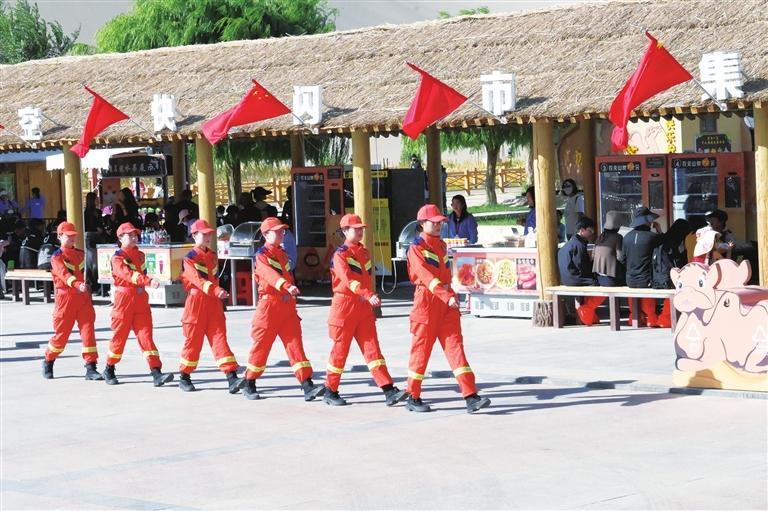 溫情關(guān)愛(ài)救助游客。鳴沙山“萬(wàn)人大合唱”作為敦煌近年來(lái)的熱門(mén)文旅項(xiàng)目,暑期每日吸引數(shù)萬(wàn)游客前來(lái)打卡,人群密集,安全隱患不容忽視。根據(jù)敦煌市委、市政府的安排,大隊(duì)每天派出消防車(chē)輛和指戰(zhàn)員現(xiàn)場(chǎng)執(zhí)勤,并根據(jù)實(shí)際需要在月牙泉和鳴沙山設(shè)置了兩處群眾服務(wù)救助執(zhí)勤點(diǎn),由20人組成“九色鹿”女子消防服務(wù)隊(duì),提供傷病緊急救助、失物尋找、人員疏散引導(dǎo)、安全知識(shí)宣傳教育等服務(wù)。僅今年,就幫助找回走失兒童21名、手機(jī)和錢(qián)包60余件,救助中暑等突發(fā)疾病游客7人。“九色鹿”女子消防服務(wù)隊(duì)的隊(duì)員們既懂外語(yǔ),又了解敦煌文化,還熟悉消防安全知識(shí),掌握一定的醫(yī)療救助和應(yīng)急救援技能,她們的貼心服務(wù)受到了游客的好評(píng),成為敦煌一道亮麗的風(fēng)景線。