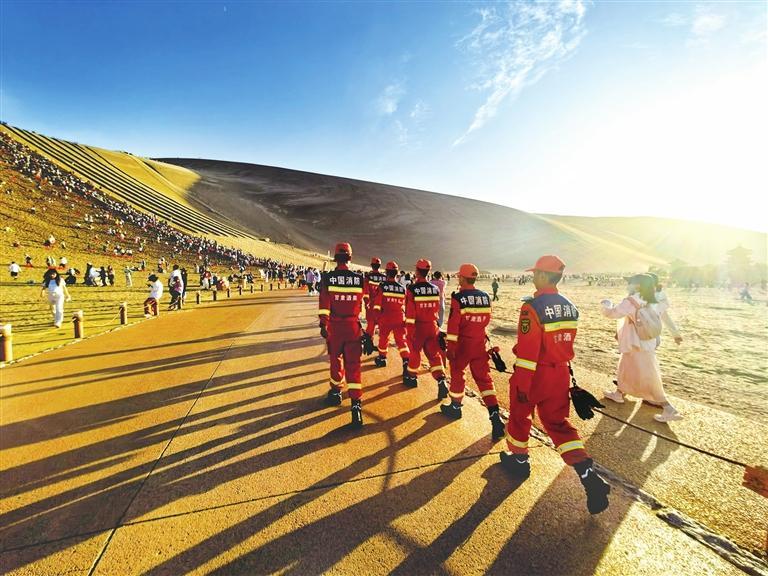 敦煌市消防救援大隊(duì)指戰(zhàn)員在鳴沙山月牙泉景區(qū)開(kāi)展流動(dòng)執(zhí)勤。