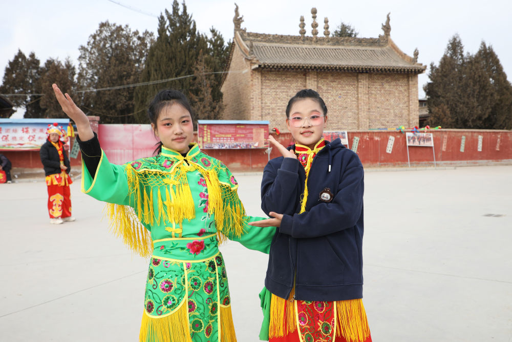 2月14日,在甘肅省蘭州市榆中縣,王欣怡(右一)、王欣語(右二)在社火表演排練間隙合影。新華社記者 張智敏 攝